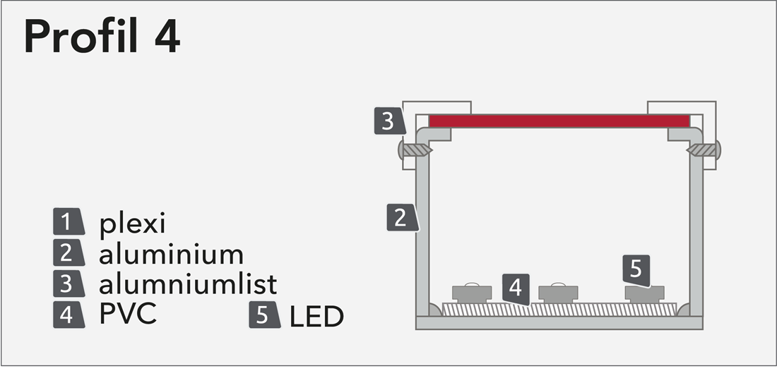 Profil 4 är en framåtbelyst skylt med front I akryl och bokstavskropp I aluminium. Akrylfronten fästs mot bokstavskroppen med en plåtlist som hjälper till att rama in bokstaven. Inuti bokstaven monteras dioder som lyser upp akrylen inifrån. Akrylfronten kläs in I folie. Folien går att få I en stor mängd kulörer. Kan monteras separat, på distanser eller på ram.