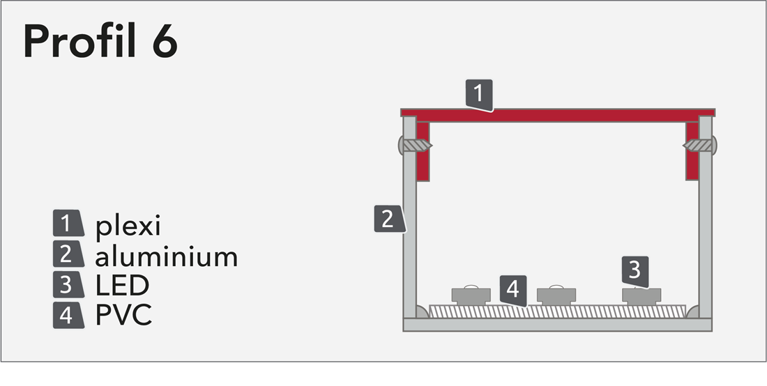 Profil 6 är en framåtbelyst skylt med front I akryl och bokstavskropp I aluminium. Akrylfronten fästs på insidan av bokstavskroppen. Hela fronten blir då belyst. Inuti bokstaven monteras dioder som lyser upp akrylen inifrån. Akrylfronten kläs in I folie.. Folien går att få I en stor mängd kulörer. Det här är en av de populäraste typerna av skylt I dagsläget Kan monteras separat, på distanser eller på ram.
