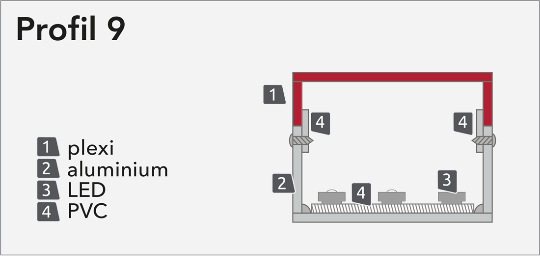 Profil 9 har front och en del av sidorna I akryl. Den nedre delen samt baksidan av bokstavskroppen tillverkas I aluminium. Den här profilen tillåter belysning av olika kulörer på front och sida. Kan monteras separat, på distanser eller på ram.