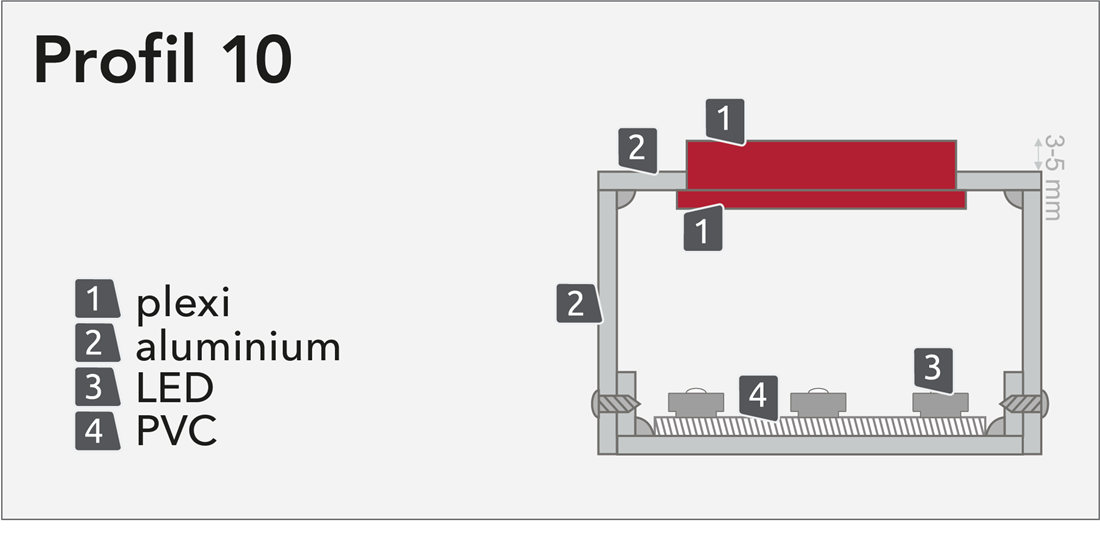 Profil 10 är en av de vanligare profilerna. Den används ofta som flaggskylt. Alltså en dubbelsidig skylt som sticker ut från fasaden. Fronten är tillverkad av aluminiumplåt där texten fräses ur, för att sedan fräsa ut en bokstav av 10 mm akryl som beläggs med folie eller 3 mm färgad akryl. Akrylbokstaven monteras därefter in i den urfrästa fronten och monteras sedan med lysrör. Texten kommer att lysa i ytterkonturen och kan även lysa framåt om man tillämpar genomskinlig folie eller akryl.