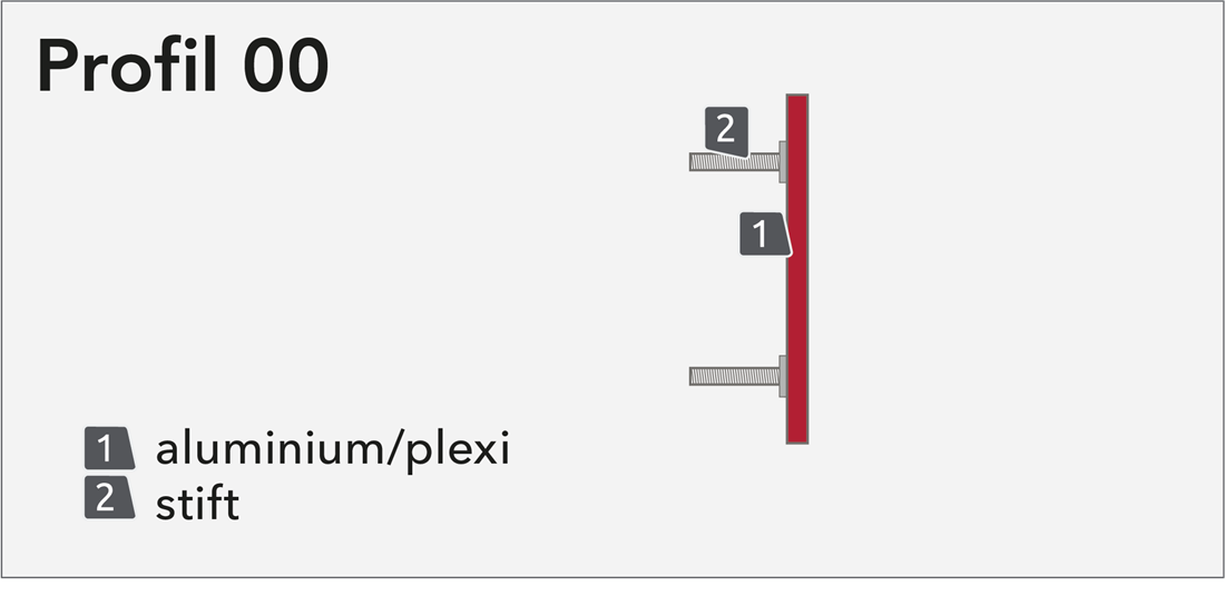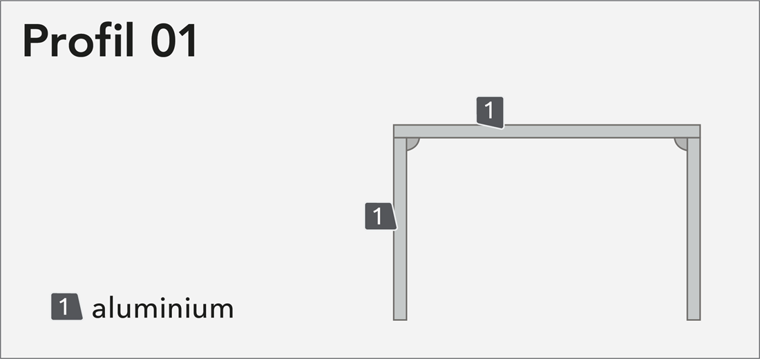 Profil 01 är väldigt lik profil 00. Den tillverkas oftast I aluminium men andra metaller funkar också. Profilens djup kan varieras. Monteras separat, påstift/distanser eller ram.