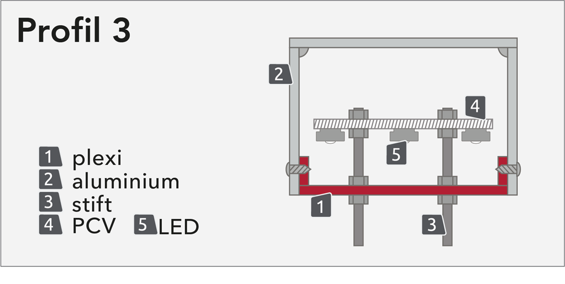 Profilen är normalt 3 mm djup. Profilen är en relativt billig och snygg lösning. Kan monteras på stift/distanser, ram eller platt mot vägg.